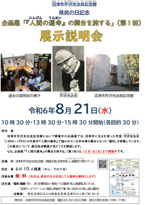 【#沼津市#芹沢光治良記念館無料開館&展示説明会】開催中の企画展の見どころを職員が解説します日時:8月21日(水)#県民の日9時~16時半(入館は16時まで)説明会:10時半、13時半、15時半開始(..
