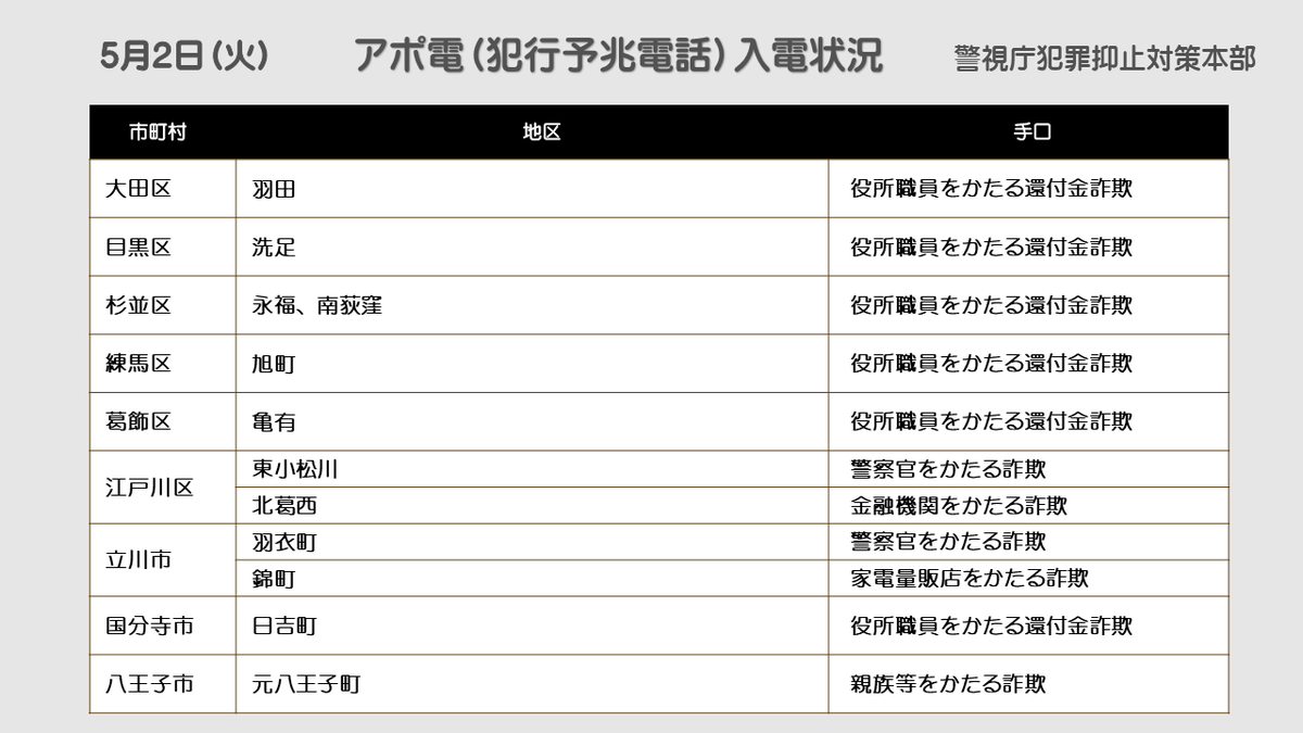 ■本日(5月5日(金))、杉並区内に、高井戸警察署の警察官をかたる者からウソの電話が入っています。主な入電地区は以下のとおりです。 ・方南■電話の内容・「犯人を捕まえた」・「犯人があなたの情報を持って..