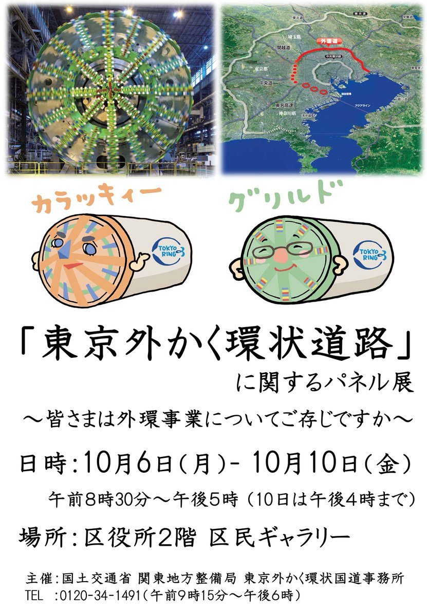/「#東京外かく環状道路」に関するパネル展開催\本線シールドマシンの区への到達を控え、外環事業・工事状況などを紹介するパネル展示を行います。10/6(月)~10/10(金)8:30~17:00(10日..