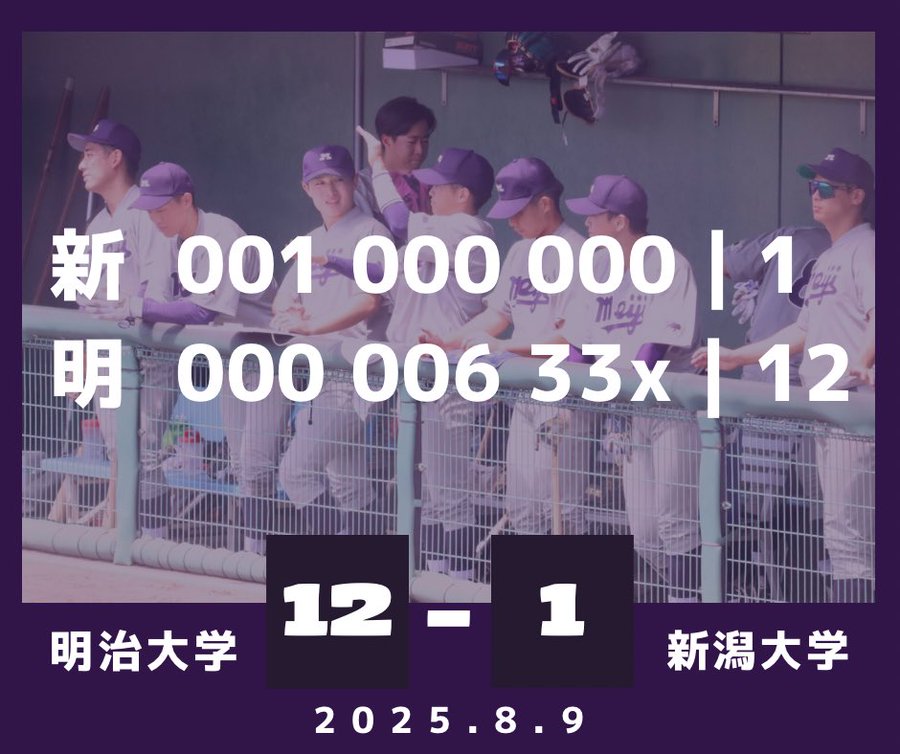 【大学野球サマーリーグ】 *本日の試合結果* ○明治大学 12-1 新潟大学 新 001 000 000 = 1 明 000 006 33x = 12 #明治大学野球部 #奪冠 #大学野球サマーリーグ