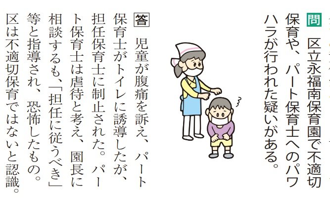 杉並区立の保育所で虐待の通報があった時は、園長だけでなく、区の役人まで、躍起になって揉み消しました。さらに、通報者がパワハラで退職を余儀なくされるという、最悪の結末…共産党など、公営バンザイの左派政党..