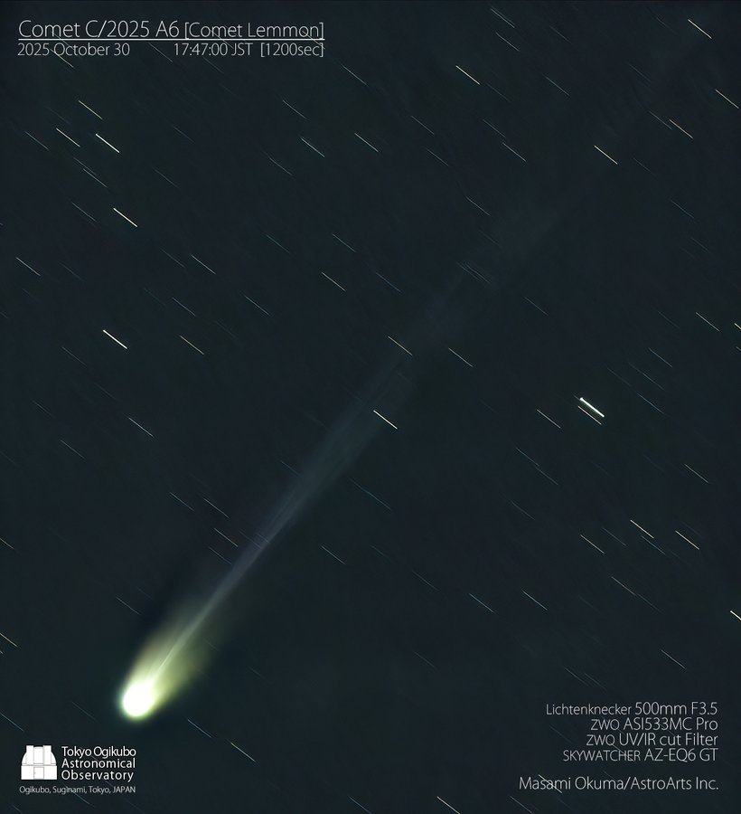 10月30日夕刻のC/2025A6_Lemmon彗星。500mm+ASI533MCProの組み合わせで撮影し、目一杯強調すると、都内でも画角をはみ出すイオンの尾が確認できる(画像はボロボロになっちゃう..