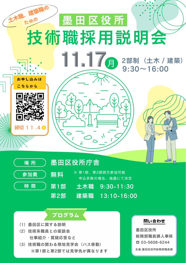 【採用説明会のお知らせ】土木職・建築職を対象とした採用説明会を実施します。まちづくりに携わりたい方、地域に根ざして働きたい方必見!職員が仕事内容や魅力をわかりやすくお伝えします。詳細・申し込みはこちら..