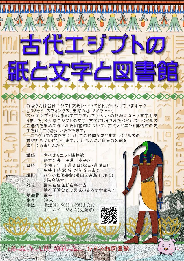 ひきふね図書館では11月3日に古代エジプトの紙と文字と図書館の講座を開催します。大人の参加も可能です。パピルスに自分の名前を書いてみませんか?詳細/お申込みはこちらhttps://library.su..