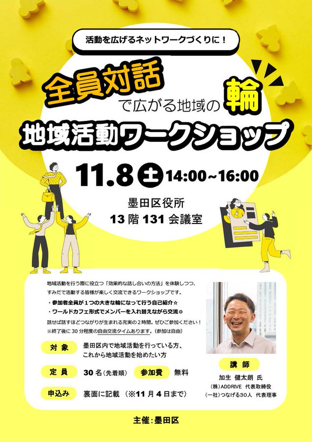 受付延長しました【地域の輪を広げよう!地域活動ワークショップ】11/8(土)墨田区役所にて開催まだお申込み間に合います!地域で何か始めてみたいという方はぜひご参加ください申込は11/6までhttps:..
