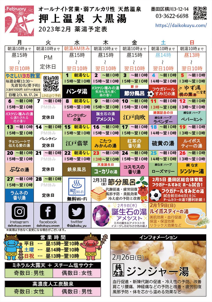 2023年2月の薬湯予定表が完成いたしました!2月3日は節分風呂!大豆を使った薬湯です!4日のフウガドールすみだの湯は、翌日のホーム試合に向けてチームカラーの湯で応援!その他、美肌効果のあるルイボステ..