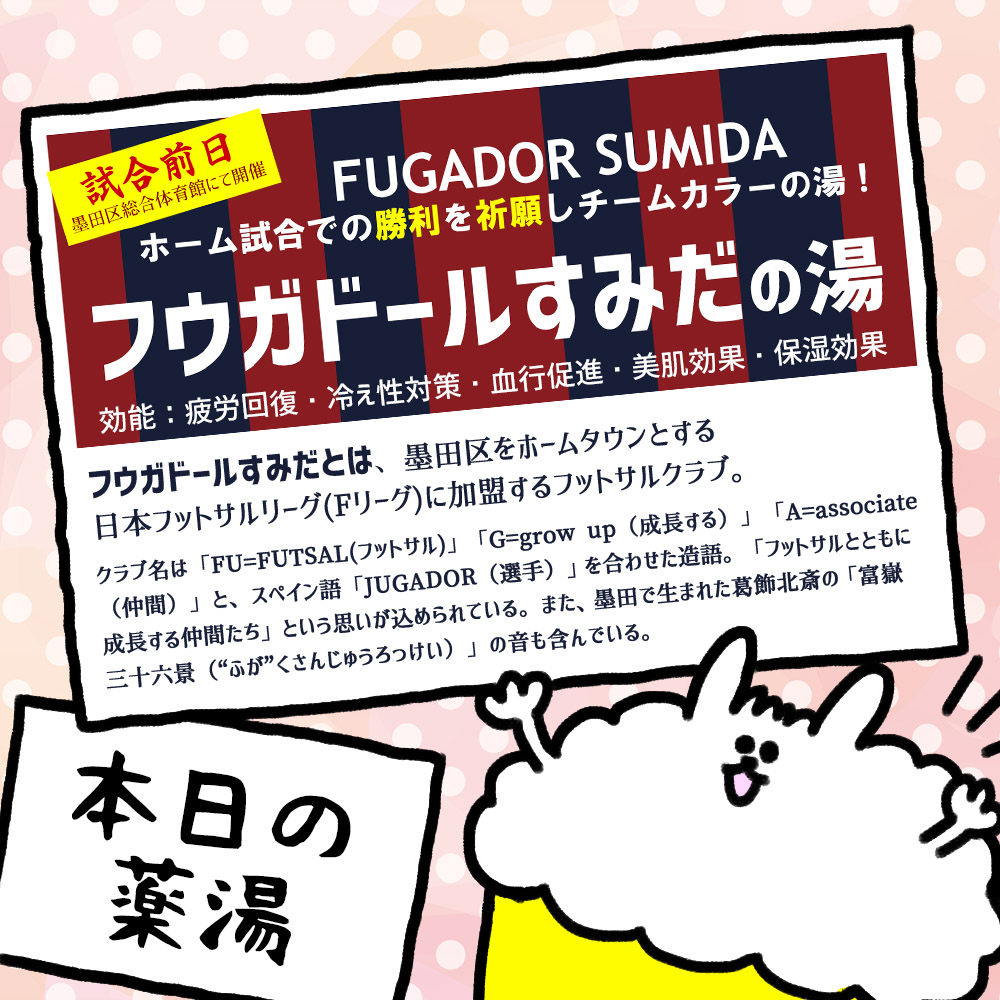 本日2月4日(土)は14:00~朝10:00まで営業!薬湯は「フウガドールすみだの湯」⚽フウガドールすみだは、墨田区をホームタウンとするフットサルクラブ。オフィシャルパートナーを務める大黒湯は、ホーム..