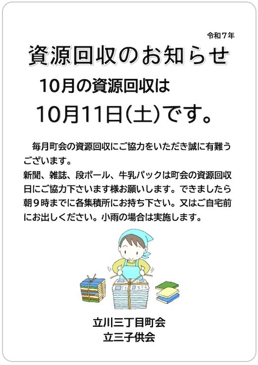 資源回収のお知らせ令和7年10月の資源回収は10月11日(土)です。