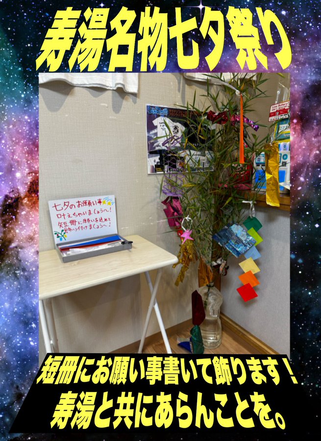 七夕もまもなくですね笹と短冊設置しました是非お願い事書いてみてください〜!明日から近所のかっぱ橋本通りでは下町七夕まつりも開催されます!オススメは焼き立てのかっぱステーキお祭の後に是非お風呂へ♪僕の実..
