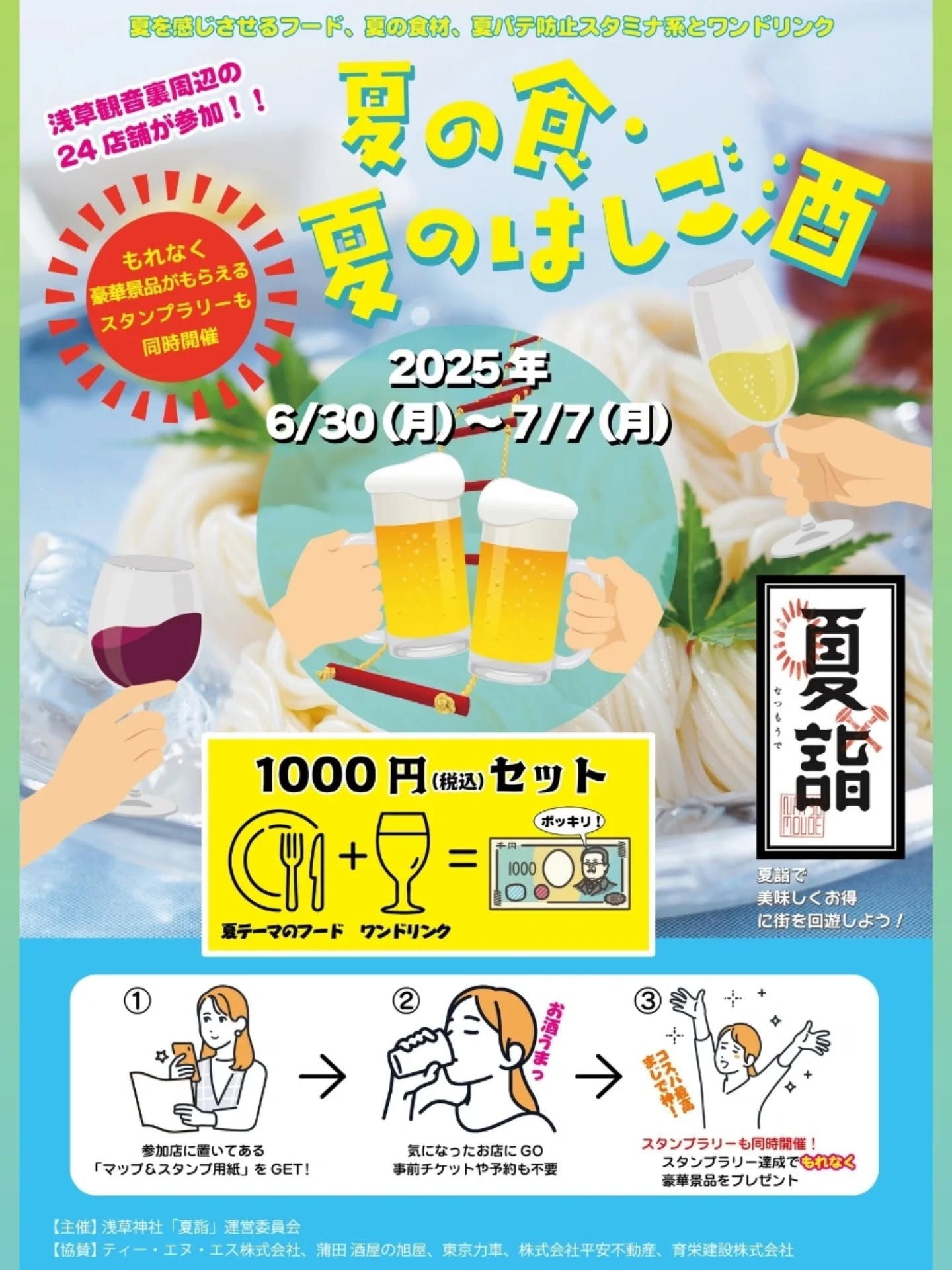 【ご案内】🎐夏詣企画「夏の食・夏のはしご酒」夏の食材をメニューにした一品とドリンクのセットが1000円で楽しめます。規定の店舗を巡ってスタンプラリーを達成すると、浅草神社から特別なプレゼントがございま..