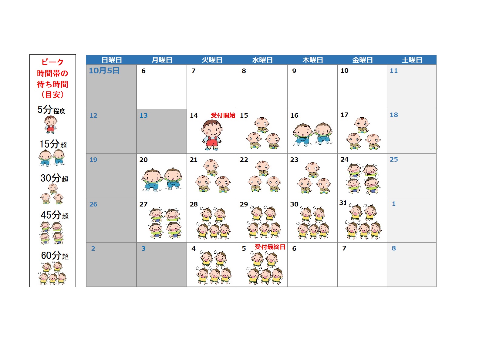 混雑するのは10月下旬から11月5日受付最終日までの後半2週間です。この時期に申請に来られる方が非常に多く、ピークの時間帯は1時間待ちとなるほど窓口が混み合います。受付開始日の翌週くらいまでの期間は、比較的窓口が空いています。