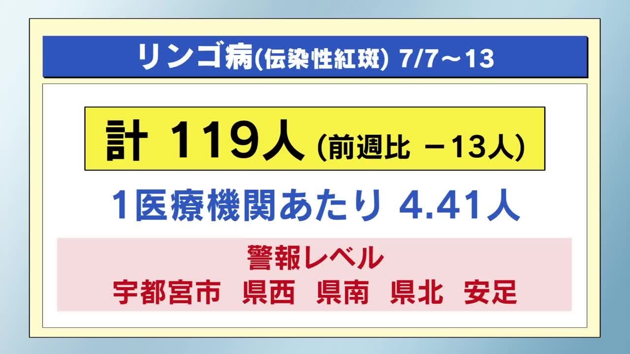 栃木県内の医療機関から7月13日までの1週間に報告された感染症のうち、一部の地域でリンゴ病とA群溶血性レンサ球菌咽頭炎が警報レベルになっています。伝染性紅斑、いわゆるリンゴ病は子どもを中心に発症し風邪..