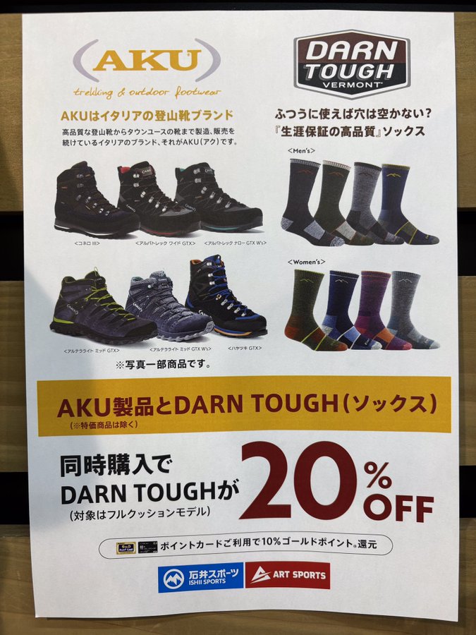 【期間限定キャンペーン】AKUの靴、ダーンタフ(ソックス)同時購入でソックスが″20%OFF″お得に靴とソックスを揃える事ができます!さらに10%ポイント還元!登山・ハイキングを始めたい方、買い替えを..