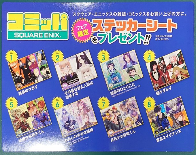 5F#落合書店#コミッパ2024冬開催中この冬も始まりました#スクエニのフェア!#スクウェア・エニックスの雑誌・コミックスをお買い上げでフェア限定ステッカーシートをプレゼント!!8種類からお選びいただ..