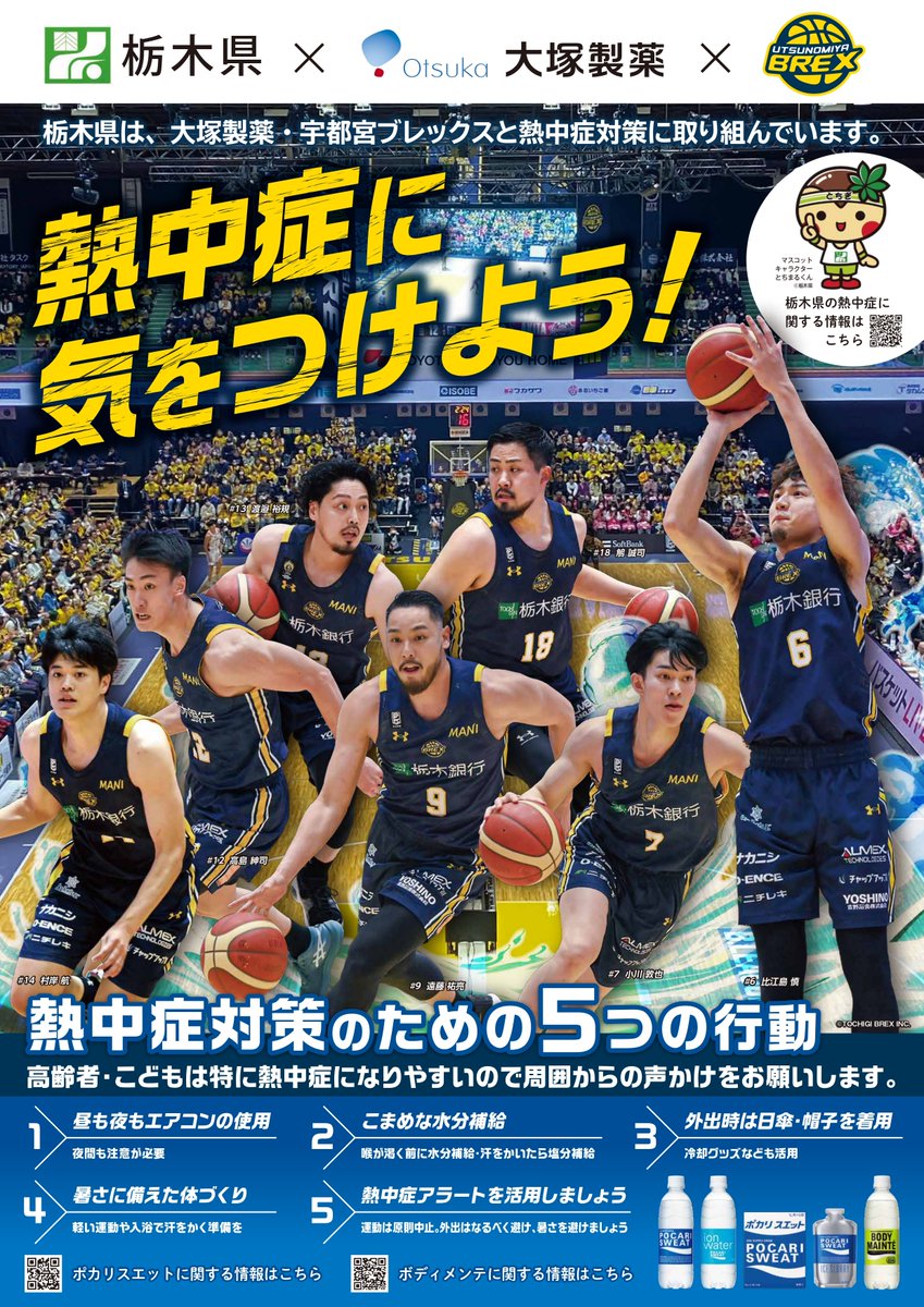 【みつけたら、熱中症対策!】県内で栃木県×大塚製薬×宇都宮ブレックスの熱中症対策ポスターを掲出中です。真夏の水分補給のポイントは『喉が渇く前に水分補給&汗をかいたら塩分補給』です。選手、スタッフも熱中..