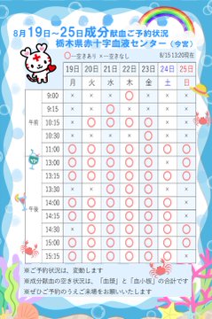 【血液センター今宮】8月19日(月)~8月25日(日)成分献血ご予約状況全血400mLのご予約は、土日を含めてまだ多数空いております最新状況は「ラブラッド」からご確認いただけますWeb版https:/..