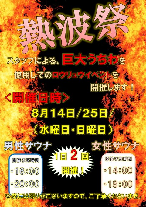明日8/25(日)はスタッフ熱波イベント開催日ですスタッフが巨大うちわで皆様を扇ぎます男性サウナ:16時・20時女性サウナ:14時・18時男性の20時回はブロワーを使用した激アツ回男性は15分前にサウ..