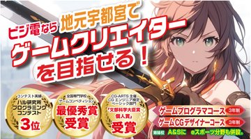 ビジ電なら地元宇都宮でゲーム関連目指せるゲームプログラマコース(3年制)ゲームCGデザイナーコース(3年制)ハル研究所プログラミングコンテスト3位、全国専門学校ゲームコンペティション最優秀賞、CG-A..
