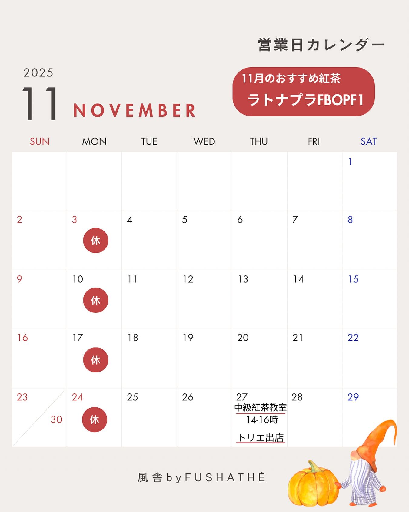 11月の営業カレンダー(現在お店は休業中です)みなさんお元気しておりますでしょうかおいものおうちでは、..