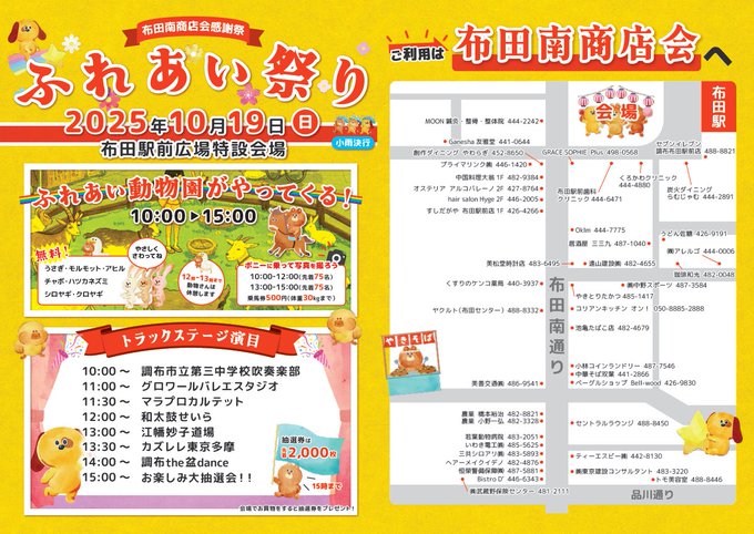 【布田南商店会感謝祭ふれあい祭り開催!】布田駅前広場にて、布田南商店会による「ふれあい祭り」が開催されますかわいい動物たちとふれあえるチャンスですご家族やお友だちと、ぜひ遊びに来てください▼詳しくは掲..