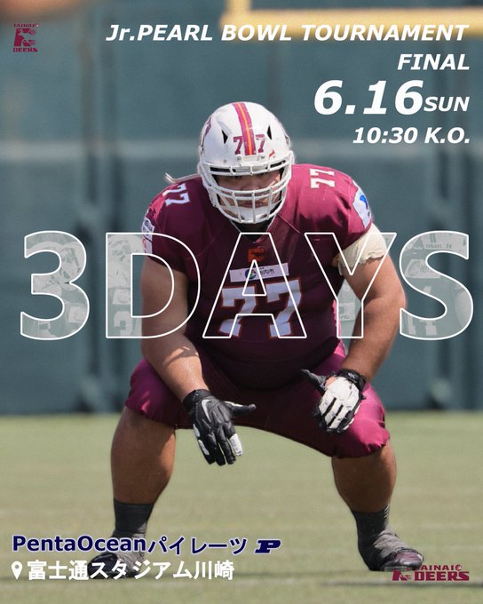 【試合前カウントダウン】決勝まであと3日!Jr.パールボウル決勝vsPentaOceanパイレーツ6/16(日)K.O.10:30富士通スタジアム川崎チケット・試合情報はこちらhttps://deer..