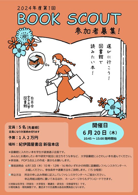 6月20日(木)に実施予定のブック・スカウトは、あと2名、参加可能です。先着順での受付となりますので、迷っている方や興味のある方は、お早めにお申し込みください!