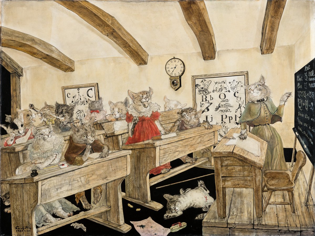 【フジタからはじまる猫の絵画史作品紹介②】藤田嗣治《猫の教室》1949(昭和24)年軽井沢安東美術館蔵©FondationFoujita/ADAGP,Paris&JASPAR,Tokyo,20..