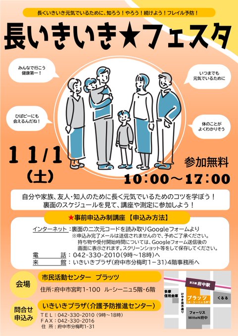 \\11/1(土)は長いきいき★フェスタ!@プラッツ//テーマは「フレイル予防」健康測定・運動講座・ひばピー登場など盛りだくさん!申込不要・年齢不問!詳細https://fcksc.org/pages..