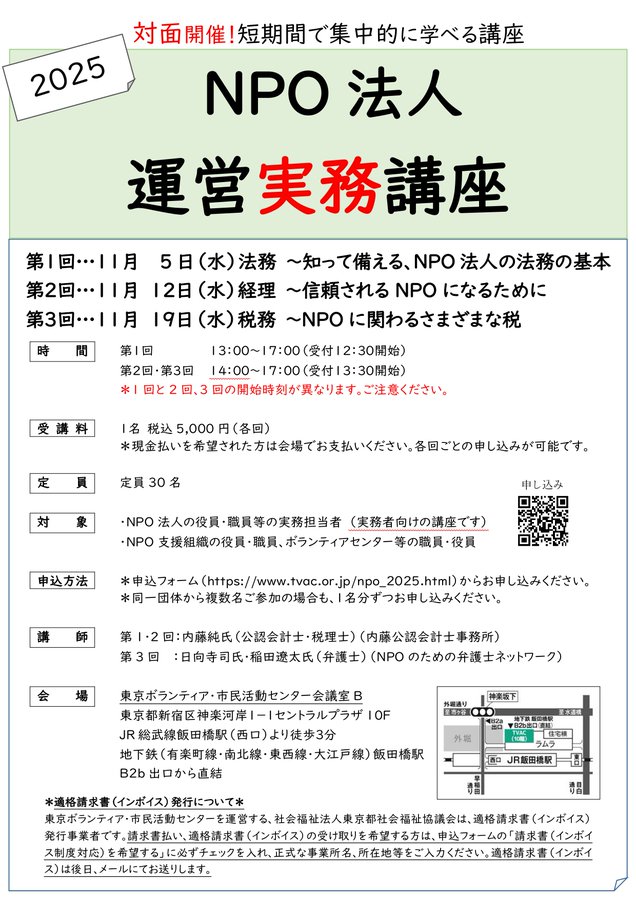 東ボラ短期集中講座 NPO法人運営実務講座2025 NPO法人運営で講義と事例を用いて解説する講座となります。 専門家に直接質問ができる https://tvac.or.jp/news/51066