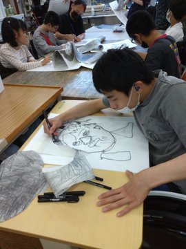 【中学部Bグループ 美術】 自画像の製作を行っています。 写真のなぞり書きから始めました。 みんないい顔です。