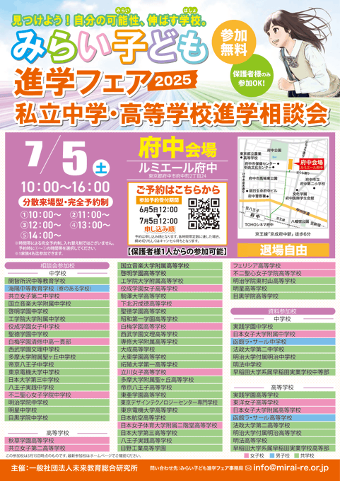 【外部相談会・中学受験】下記のイベントに参加します■「みらい子ども進学フェア2025(府中会場)」■2025年7月5日(土)10:00〜16:00分散来場制・完全予約制■ルミエール府中京王線府中駅徒歩..