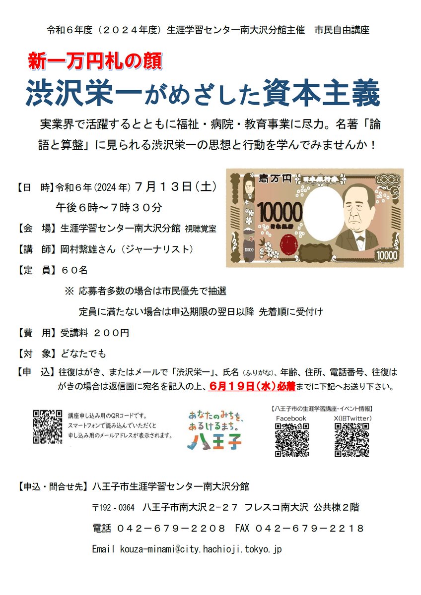 【市民自由講座】「新一万円札の顔渋沢栄一がめざした資本主義」開催!7月13日(土)午後6時00分~7時30分、生涯学習センター南大沢分館で上記の講座を開催。費用は200円。対象はどなたでも。定員60名..