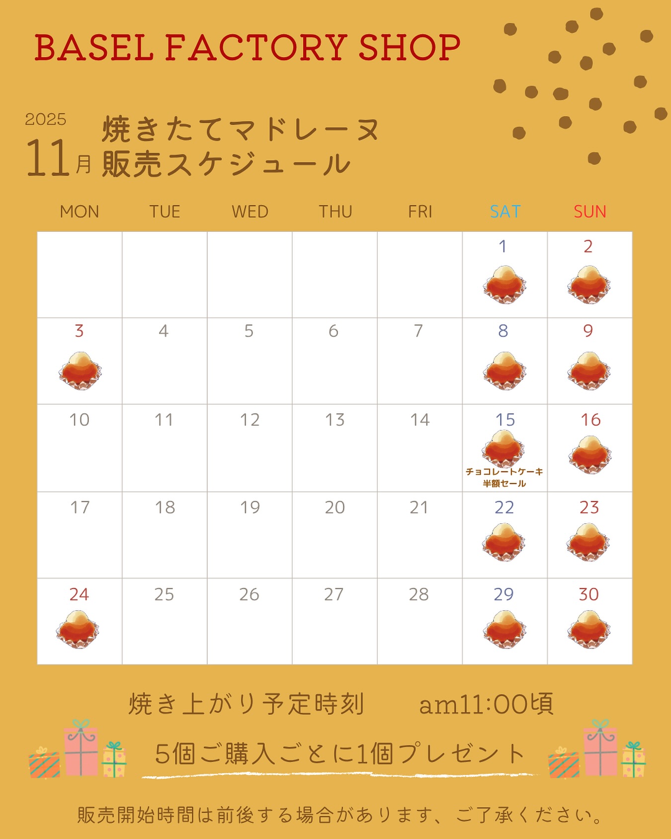 📣BASELFACTORYSHOPからのお知らせ【焼きたてマドレーヌ販売スケジュール】11月16〜30日の焼きたてマドレーヌ販売スケジュールのお知らせです✨16、22、23、24、29、30日の6日間..