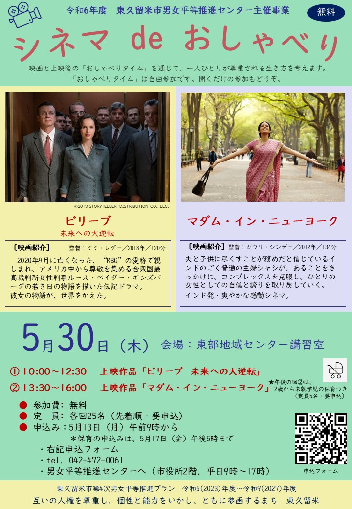 【男女平等推進センター】 シネマdeおしゃべり「ビリーブ」、「マダム・イン・ニューヨーク」 日時:5月30日(木)午前10時~午後4時 会場:東部地域センター講習室 詳細は市ホームページをご覧ください。