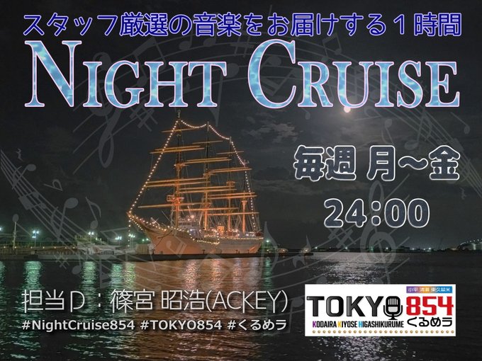 #NightCruise854月~金24:00スタッフ選曲の音楽をお届けする1時間「ACKEY'sselect/きのこの日」プレイリストは24:30頃、担当DACKEYのアカウントから@ackey_3..
