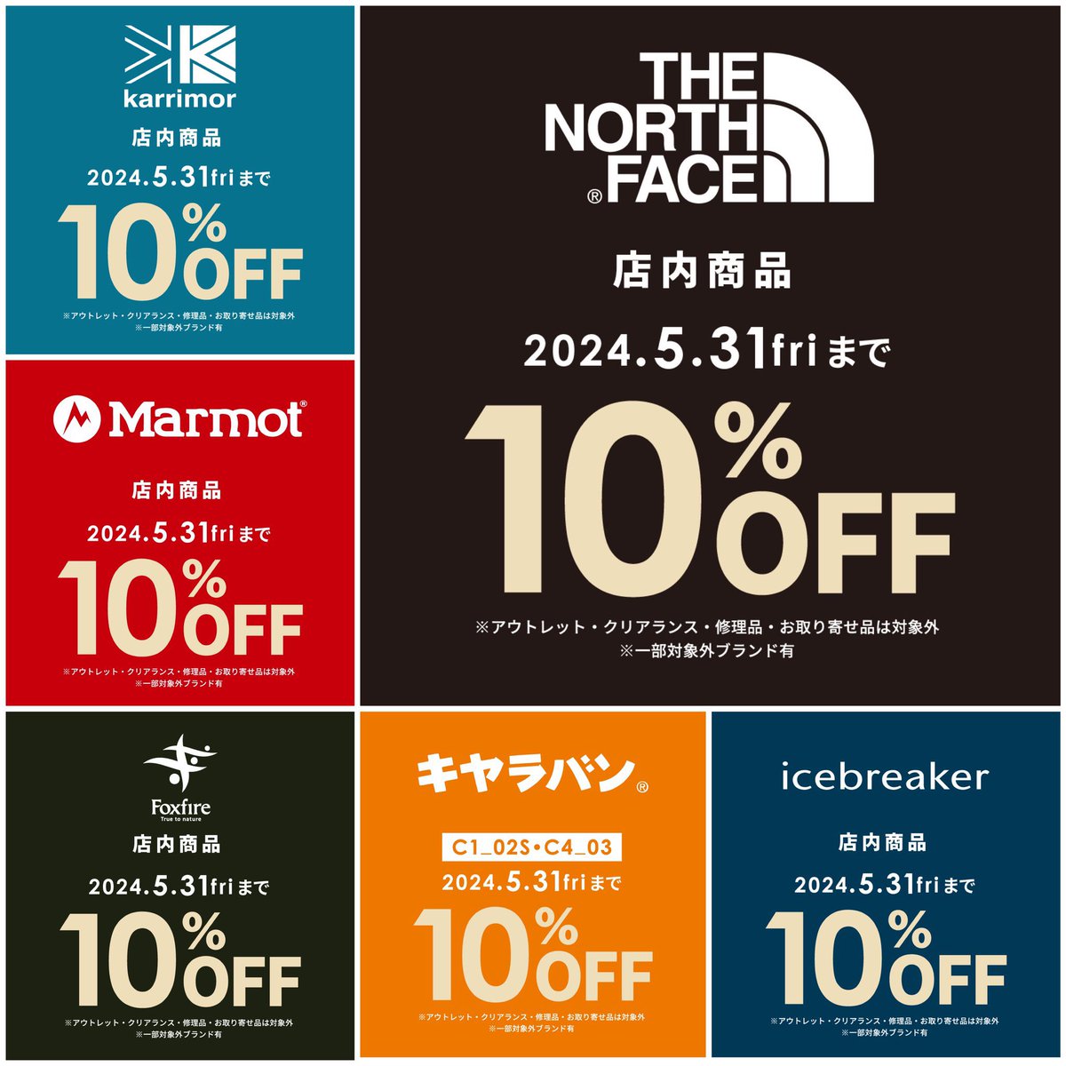 \5月最後のキャンペーン開催中/ 対象ブランドが10%OFF #ノースフェイス #アイスブレーカー #カリマー #マーモット #フォックスファイヤー #キャラバン(C1,C4シリーズ) ※定価商品のみ ※割引商品はポイント付与なし