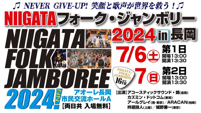 わたくし、今年も「NIIGATAフォーク・ジャンボリー」に出演をします!新潟の皆さんとの再会、とても楽しみです。今回で第16回を迎えるNIIGATAフォーク・ジャンボリー、会場はアオーレ長岡の市民交流..