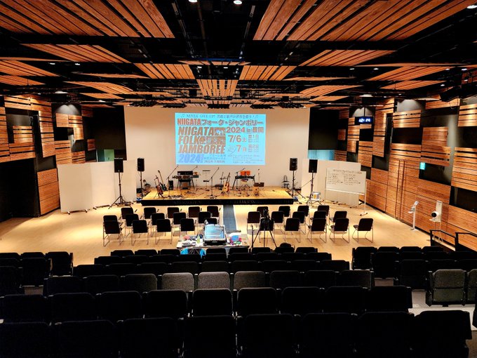 新潟県長岡市、会場のアオーレ長岡、市民交流ホールに無事到着しました。木の温もりを感じるような市民協働と交流の拠点です。 昨年以来となりますが、とても親しみを感じる場所。今日から2日間にわたって「NIIGATAフォーク・ジャンボリー」が開催されます。