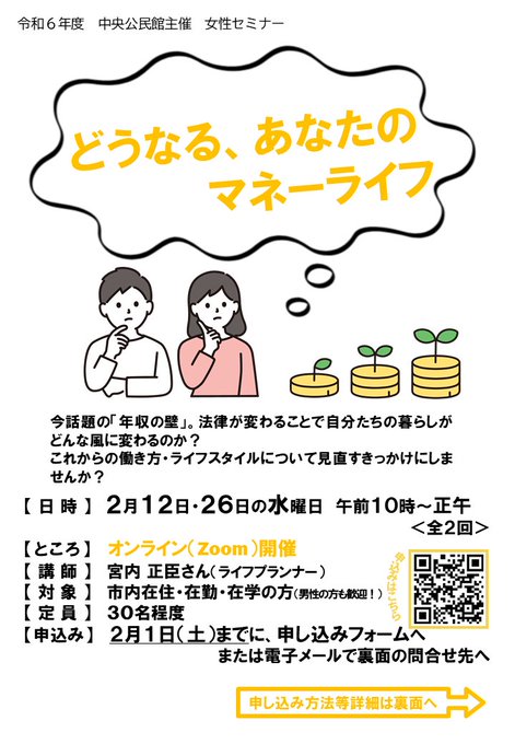 【中央公民館×マネープラン】 今話題の「年収の壁」をキーワードに、自分たちの暮らしの変化について学んで、働き方を見直しませんか?(オンライン(Zoom)開催) 日時 2月12日・26日の水曜日 午前10時~正午 全2回 申込み 2月1日(土)まで 詳しくは→https://city.kodaira.tokyo.jp/event/117/117196.html…