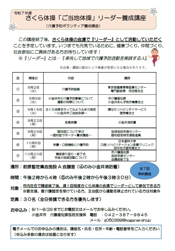 介護福祉課では、「小金井さくら体操介護予防ボランティア養成講座」(全7回コース)を開催します。介護予防の基礎知識を広く学び、ご当地介護予防体操の自主グループで活動するリーダーを養成する講座です。さくら..