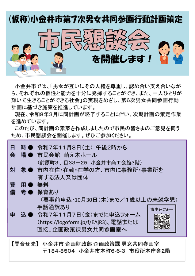 このたび、(仮称)第7次男女共同参画行動計画(素案)を作成しました。市民の皆さまへご説明するとともに、ご意見を伺うため、11月8日(土)14時から市民懇談会を開催します。詳細はHPをご覧ください。ht..