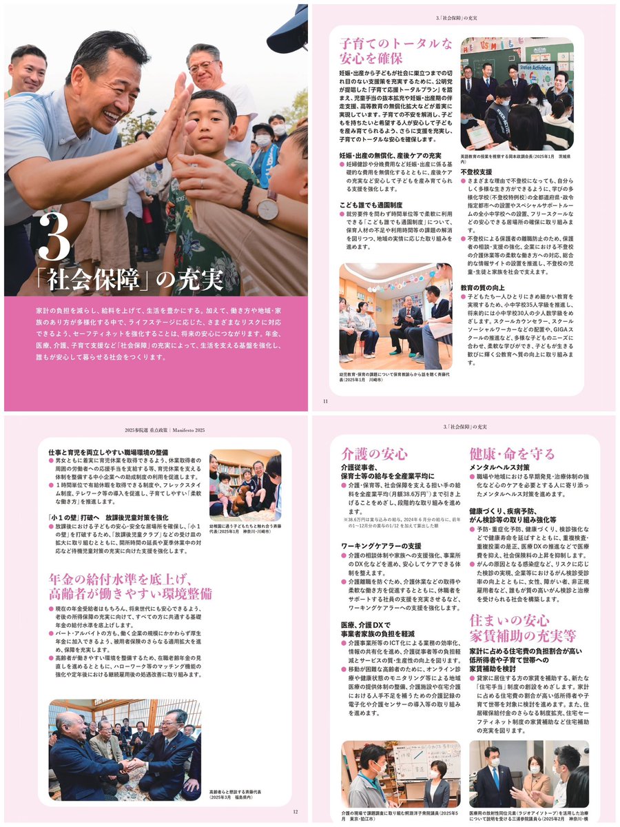 公明党〈2025重点政策〉❸「社会保障」の充実◇子育てのトータルな安心を確保◇年金の給付水準を底上げ、高齢者が働きやすい環境整備◇介護の安心◇健康・命を守る◇住まいの安心家賃補助等“やると言ったら、や..