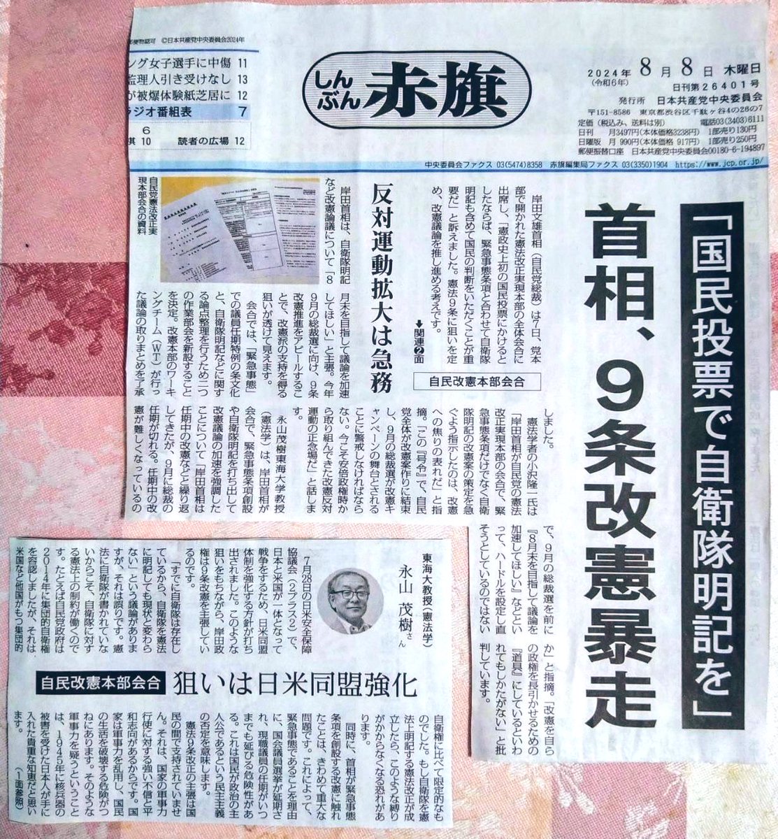 こんばんは8/8付けしんぶん赤旗です。岸田首相の9条改憲の動き、絶対に許してはなりません戦争する国にしてはなりません改憲でなく命守る政治にがんばります#戦争ダメ絶対#改憲ではなく命守る政治
