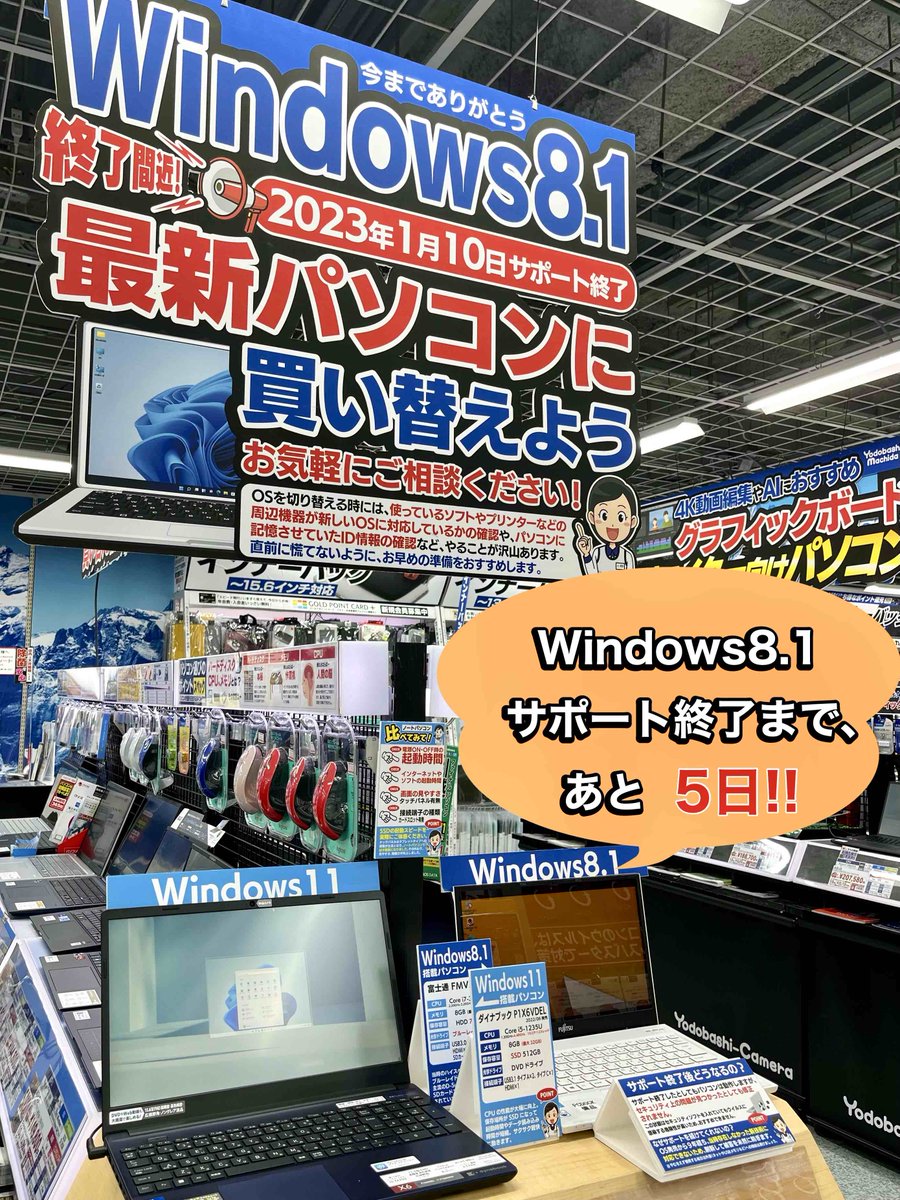 【最新パソコンに買い替えよう❗️】Windows8.1サポート終了まであと5日‼️サポート終了したパソコンは、ウイルス感染する危険性が高まります😱現在#ヨドバシ町田では買い替え応援キャンペーン実施中‼..