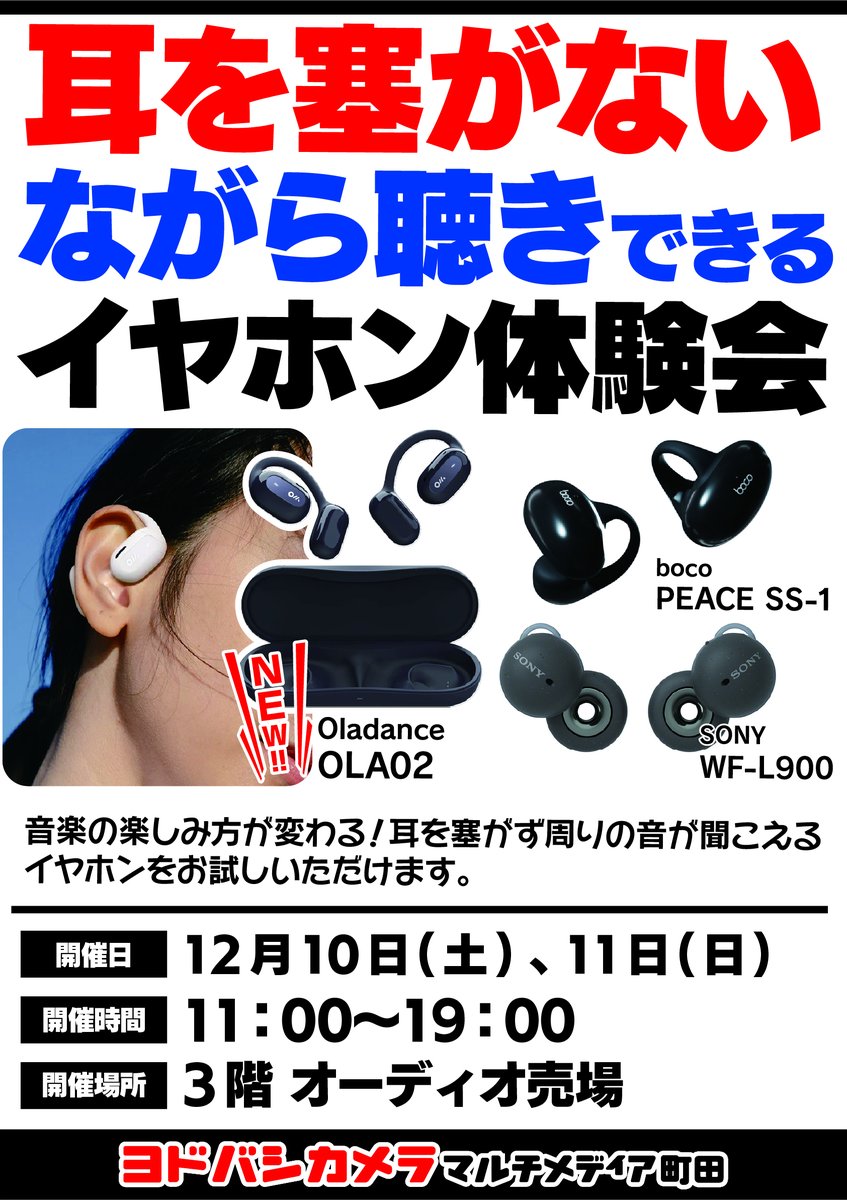 【耳を塞がないイヤホン体験会開催のご案内🎵】周りの音も聞こえて便利な骨伝導イヤホンや、穴の開いたイヤホンをご試聴いただけます✨さらに本日発売の話題の新作「Oladance」もお試し可能です👌ぜひ3階オ..