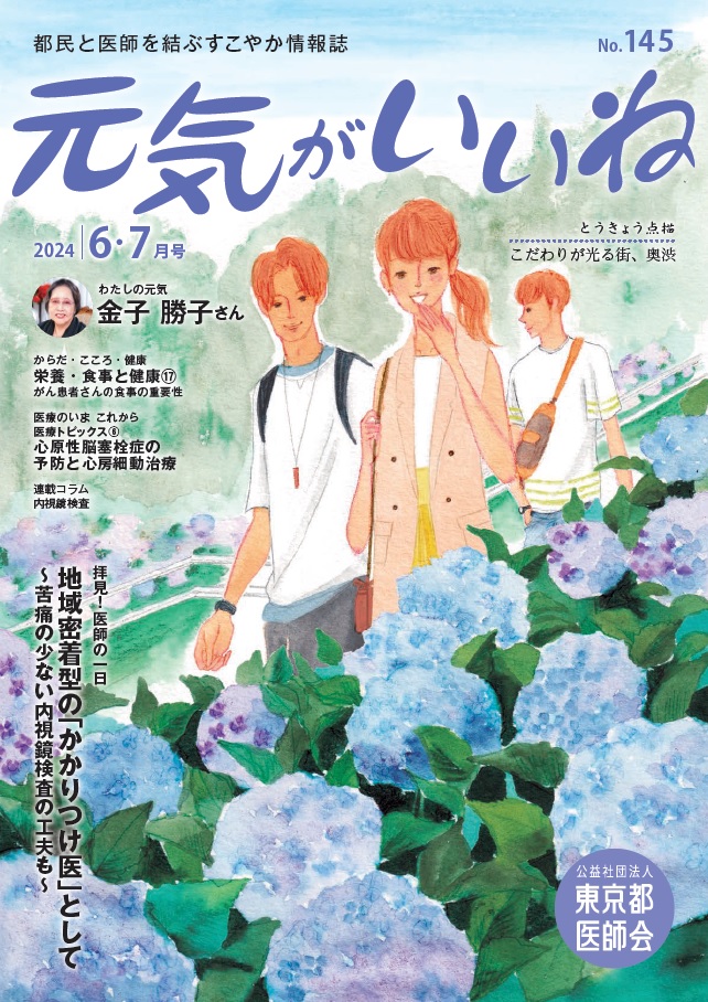 【「元気がいいね」第145号(6・7月)】 今回の「わたしの元気」はピアノ指導者の金子 勝子さん。このほか、がん患者さんの食事の重要性、心原性脳塞栓症の予防と心房細動治療などを掲載しています。 https://tokyo.med.or.jp/genki
