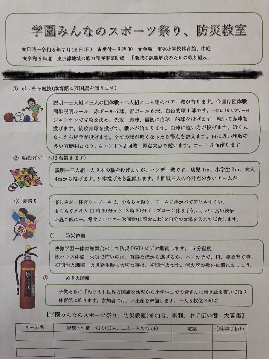 学園みんなのスポーツ祭り、防災教室のお知らせ(学園自治会より)7月28日(日)に雷塚小学校体育館及び中庭にて、学園自治会のスポーツ祭り・防災教室が開催されます。受付は8時30分から(開会式9時)です。..