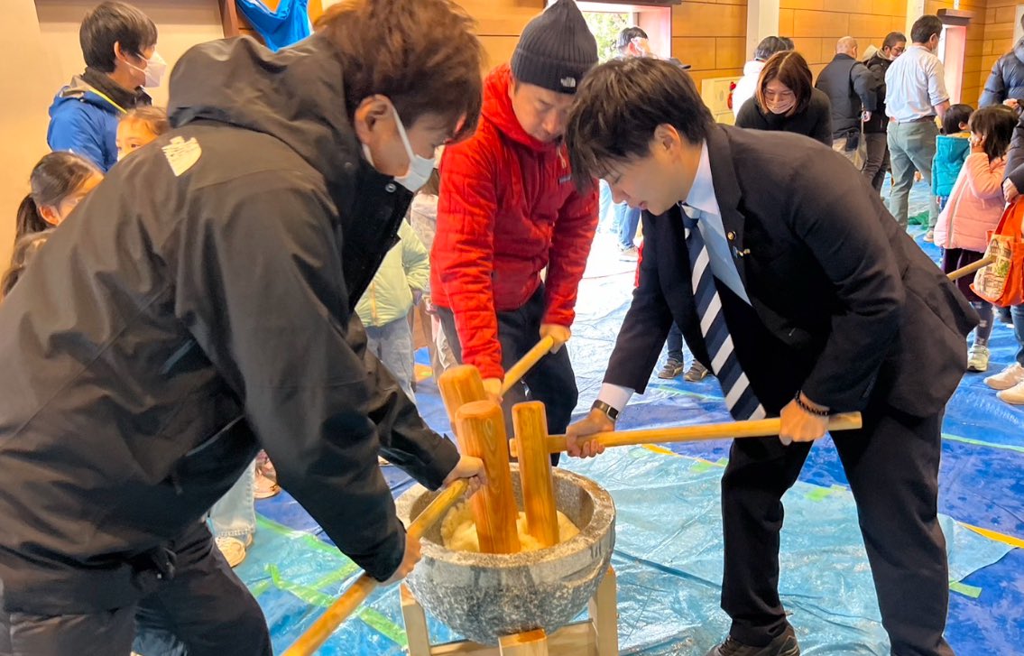 餅米を最初はつかずに、杵でこねこね。臼のまわりを回りながら均一に潰します。#餅つき#どんど焼き#関前南小#武蔵野市