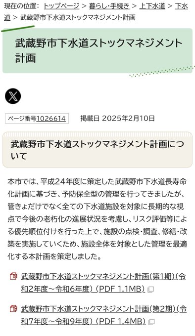 ◎武蔵野市の下水道の現況について八潮市様の事故を受けて、ご心配のご相談を多く賜ります。本市では、下水道合流改善に関わる様々な課題を解決すると同時に、平成24年から「武蔵野市下水道長寿命化計画」に基づき..