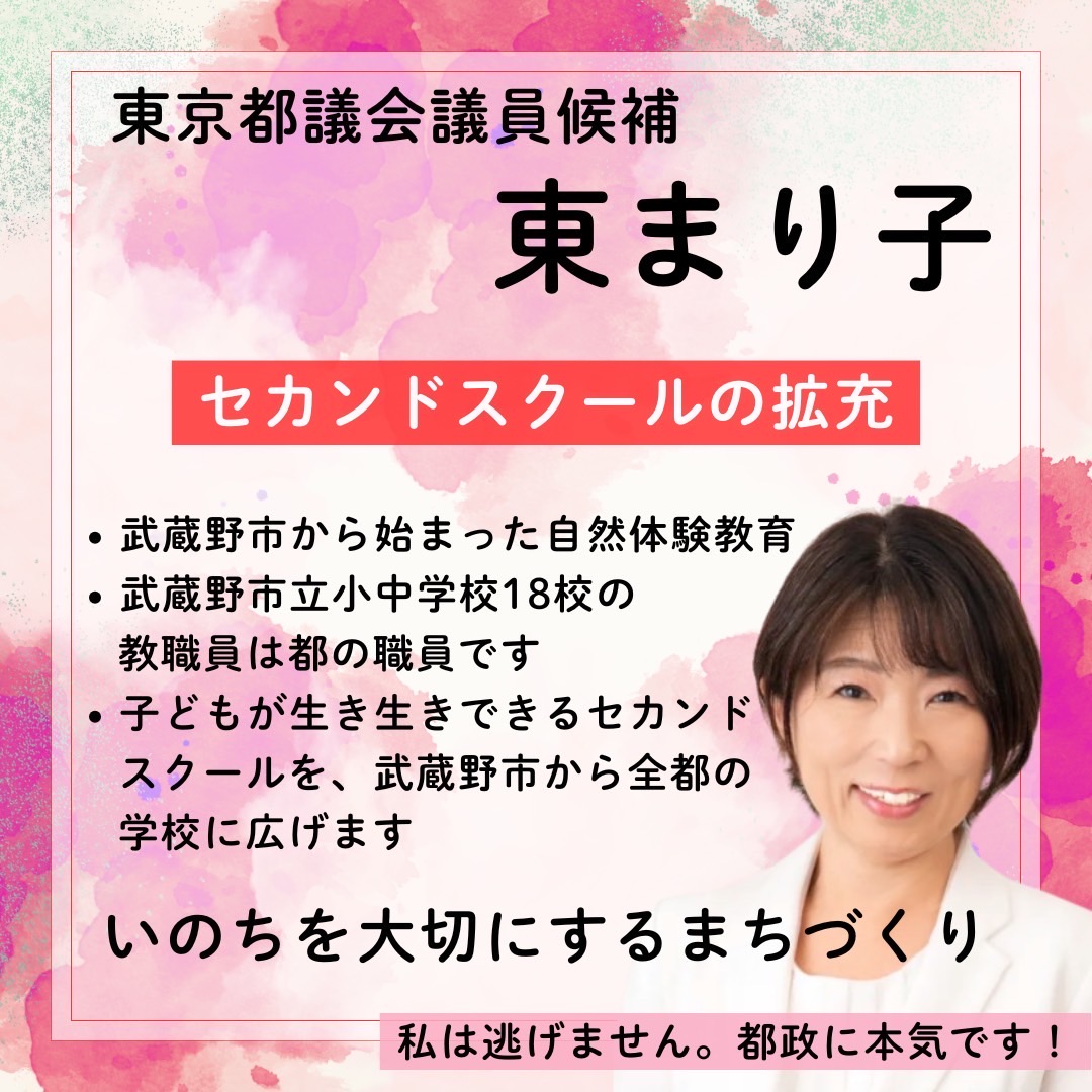 【セカンドスクールの拡充】 東京都議会議員候補の東まり子です! 【いのちを大切にするまちづくり】のために都議会議員として取り組んでいきたい7のお約束、1つ目は『セカンドスクールの拡充』です。